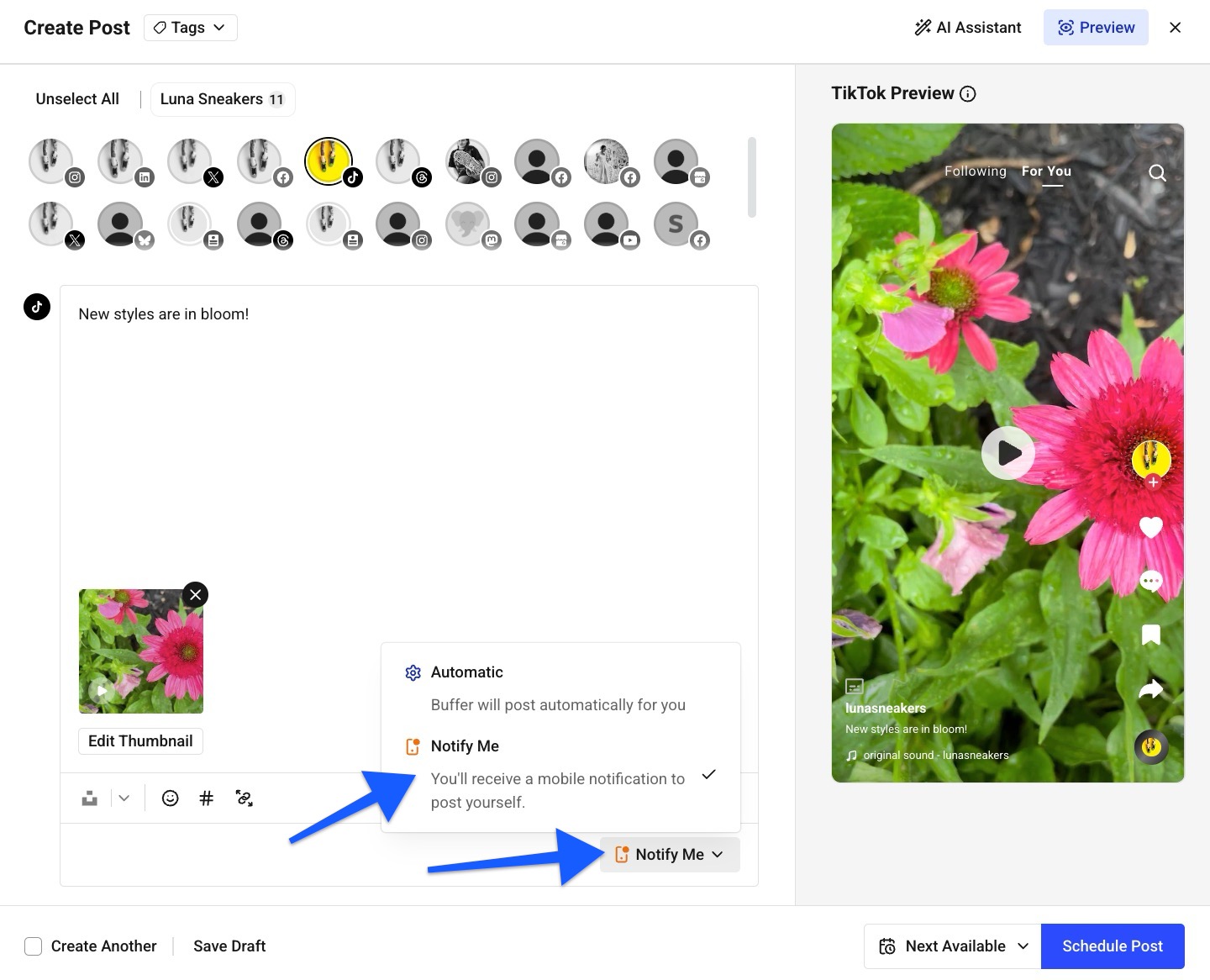 When it's time to post, you'll get a notification on your phone. You can tap it to copy your post over to TikTok, add your music, and finish posting. Learn more about Using notification publishing here. |