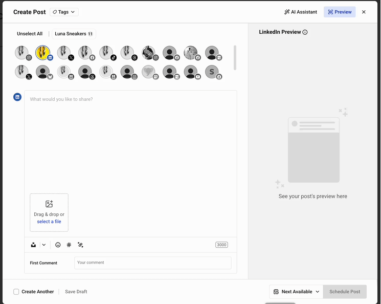 If you are on our paid plans, you'll have the option to schedule a first comment with your LinkedIn posts.
