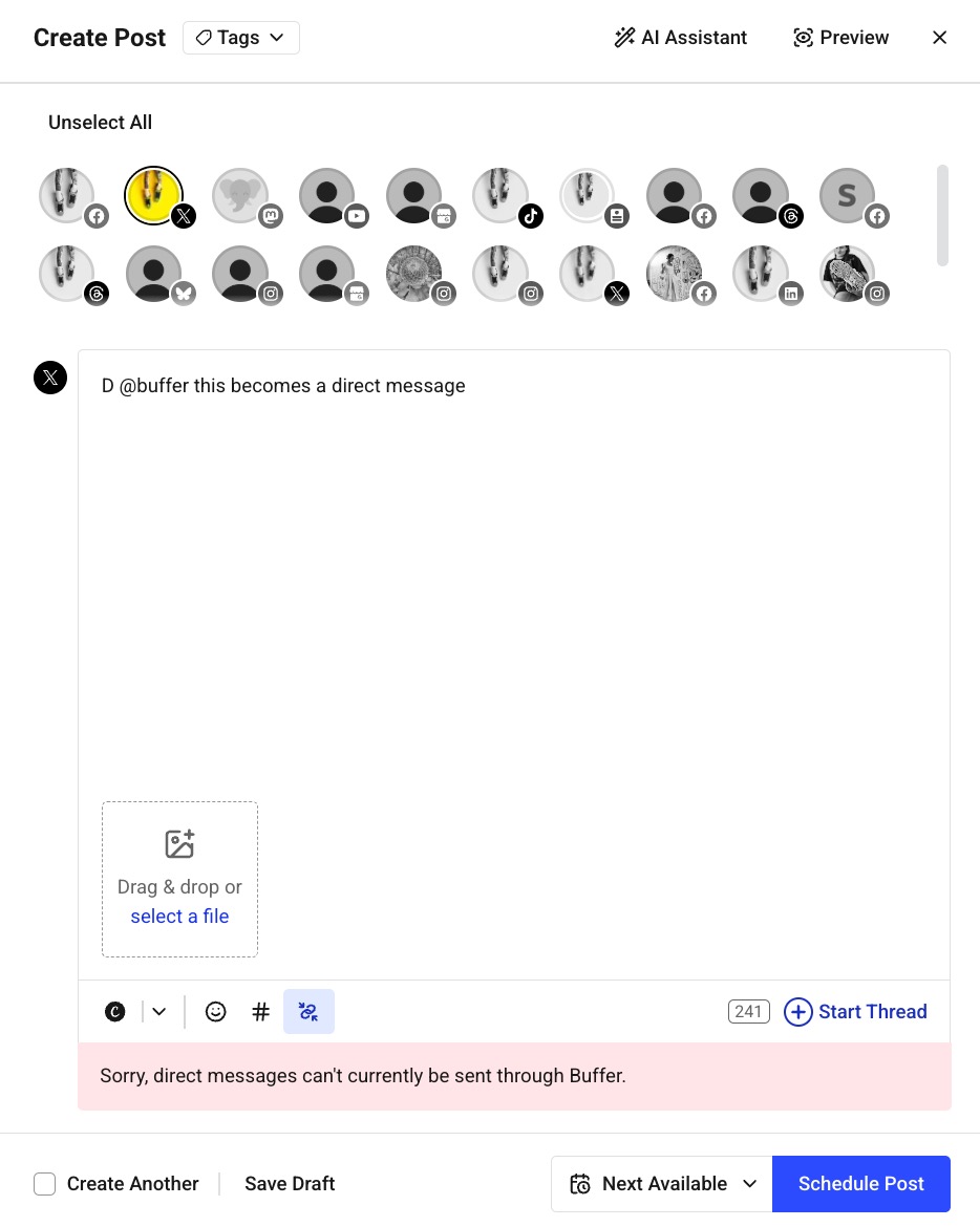 | "Sorry, direct messages can't currently be sent through Buffer." | The post begins with the letter D and a @username. D/d [username] + message is one of X/Twitter's SMS commands to send another X/Twitter profile a direct message via SMS. Here is a related X/Twitter guide on this.