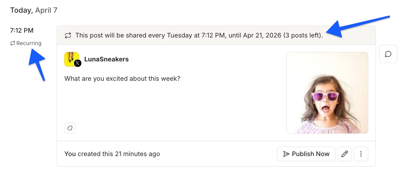 - Once you've saved the changes, you'll see a Recurring indicator on your post, under the scheduled time. You'll also see the recurring details at the top of your post.