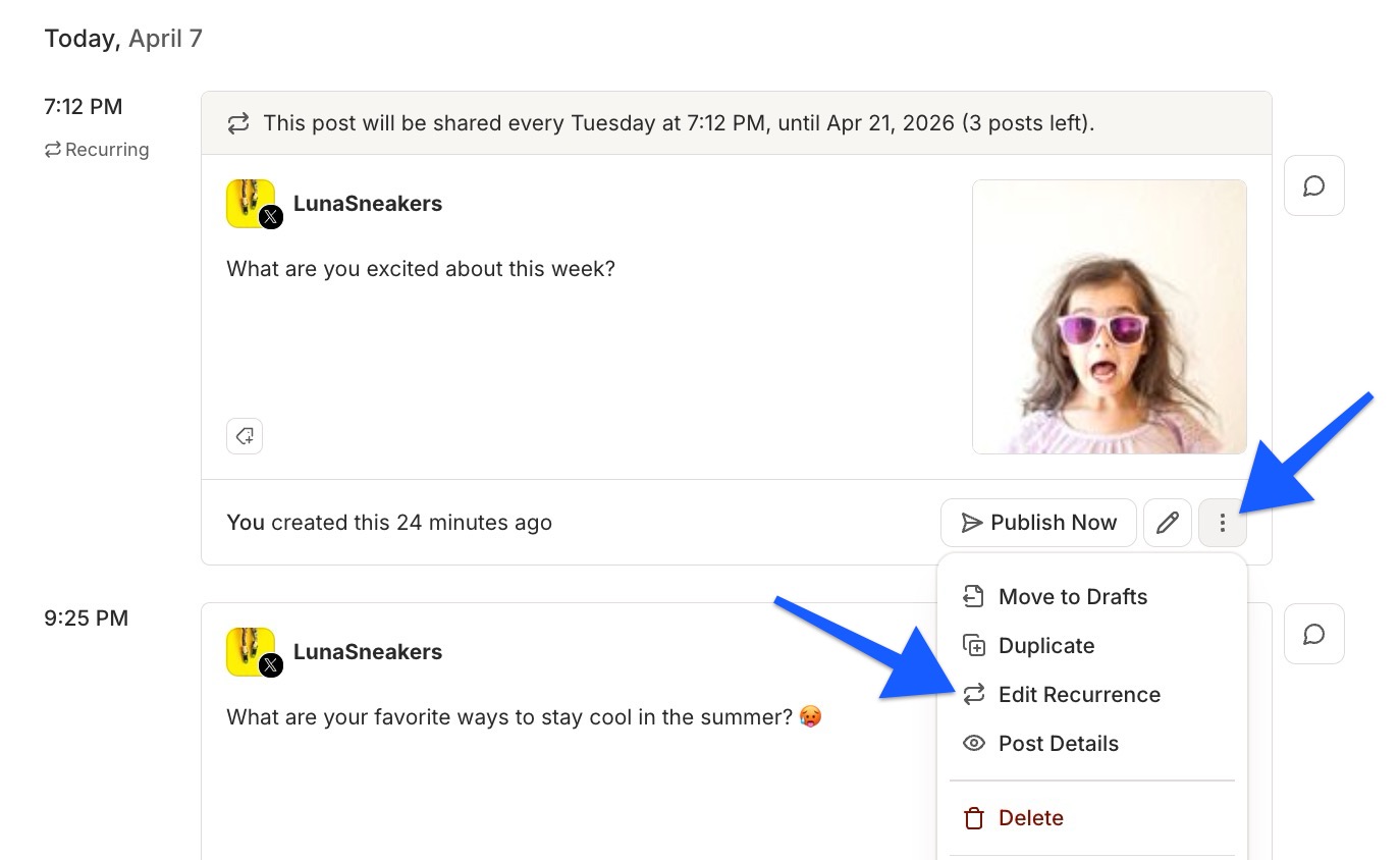 - Click the ⋮ three-dot menu on the recurring post.