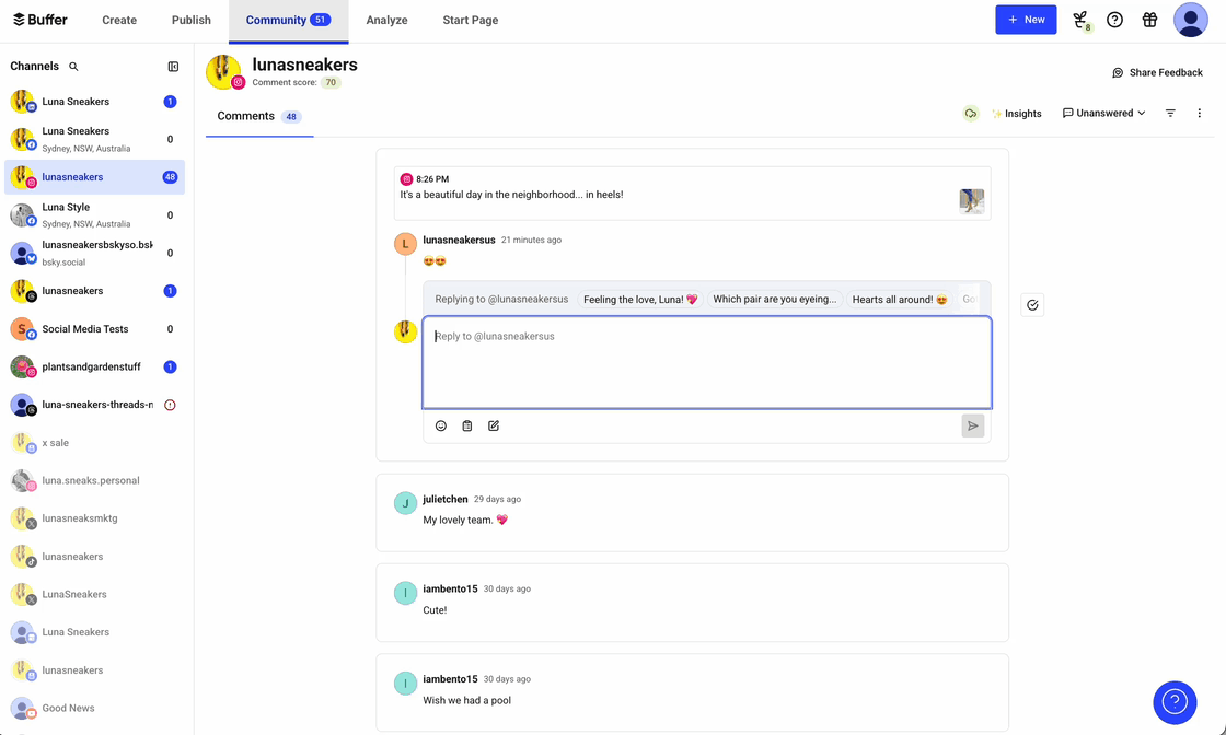 If you're in the Buffer Beta program, you have access to the most fluid way to respond to post comments made on Instagram professional accounts, Facebook Pages, Threads, Bluesky, as well as LinkedIn pages and profiles!