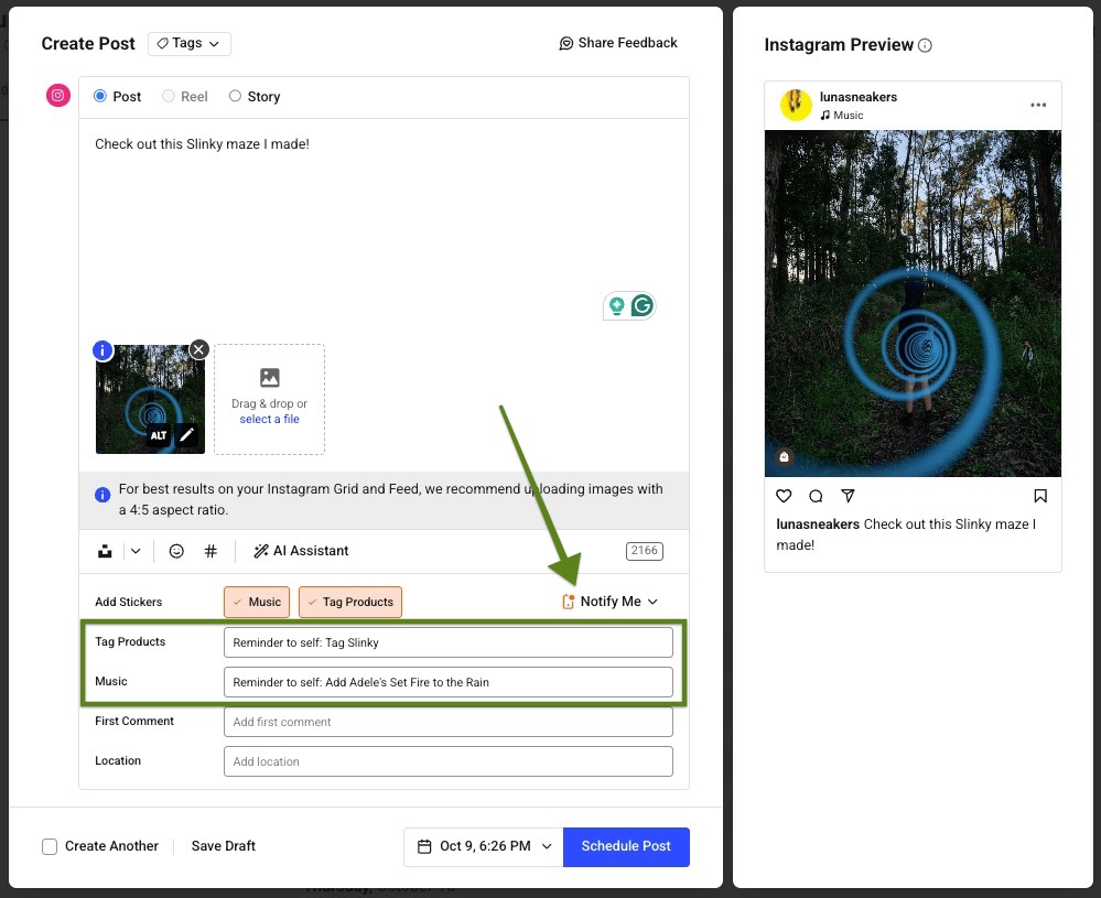 📝 Pro tip: Clicking "Music" and "Tag Products" reveals text boxes where you can add reminders of which music and products you'll add when Buffer pushes the posting notification to your mobile device.