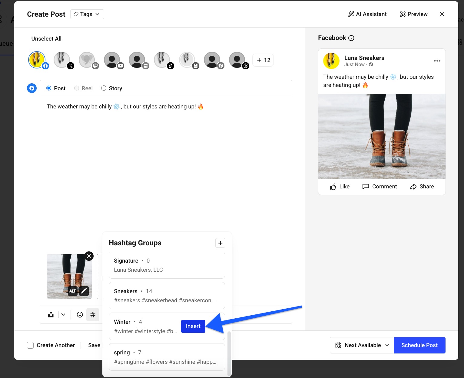 - The hashtag manager is universal across all channels, so you can use it to create and insert hashtag groups for posts on any channel.