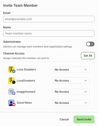 Full Posting access includes the ability to create, schedule, and publish posts for any channel they've been invited to.